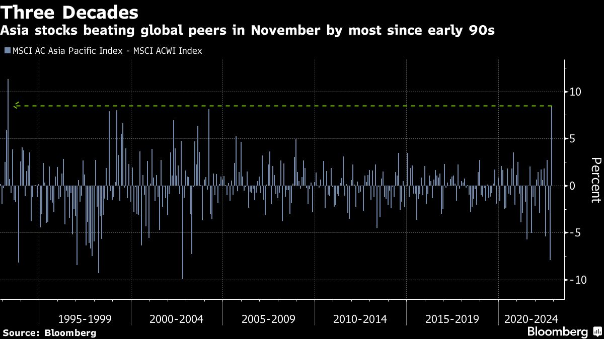 Ноември се оказа най-добрият месец за азиатските акции спрямо останалите книжа по света от началото на 90-те години.