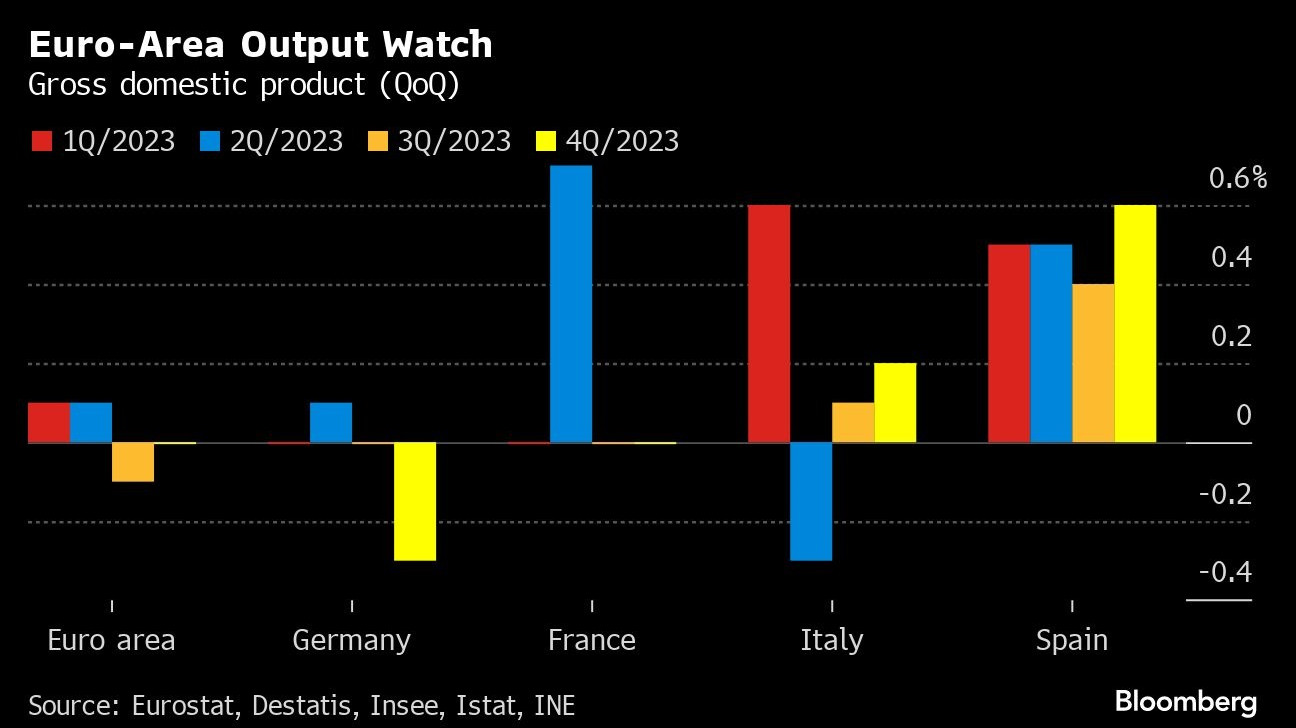 Еврозоната неочаквано е избегнала първата рецесия след пандемията, която икономисти очакваха през втората половина на 2023 г., тъй като по-стабилният растеж в Италия и Испания компенсира спада в Германия.