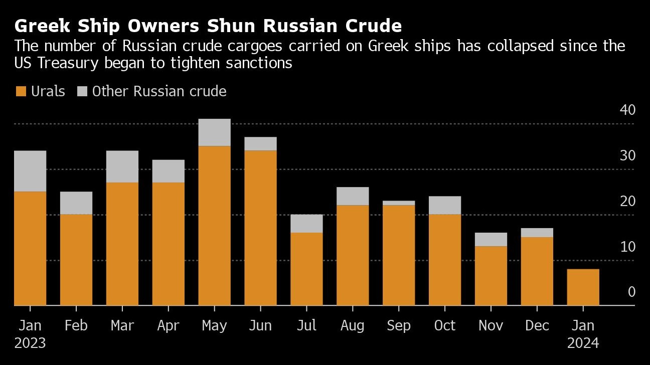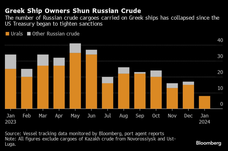 През януари броят на гръцките танкери, превозващи руски суров петрол, е намалял до едва осем, сочат данни за проследяване на кораби, събрани от Bloomberg. През май те са били повече от 40 през май и около 20 през по-голямата част от втората половина на миналата година.