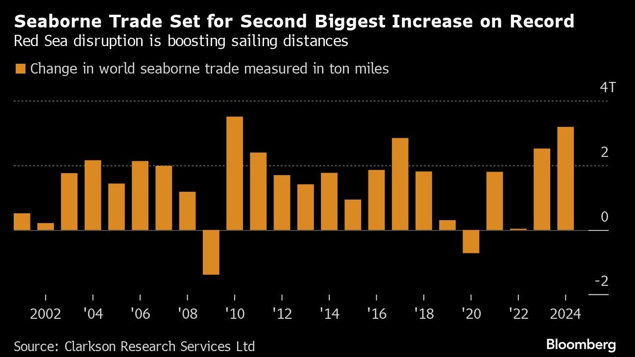 Дейността на корабоплаването, измерена в тон мили, се готви за второто най-голямо годишно увеличение в историята в резултат на геополитически смущения в Близкия изток и Европа, според Clarksons Research, звено на най-големия корабен брокер в света.