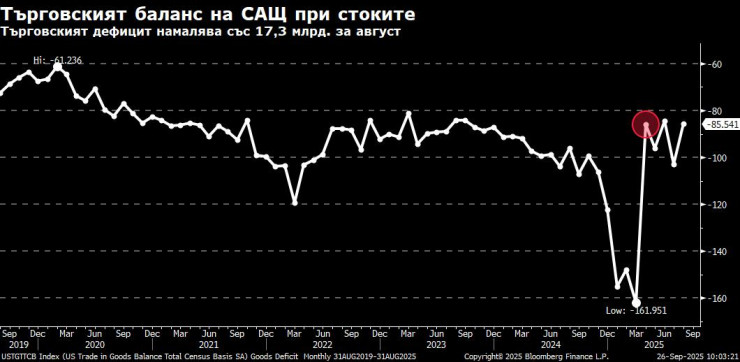 Търговският дефицит на САЩ в стоките се е понижил с 17,3 млрд. долара спрямо предходния месец до 85,5 млрд. долара през август 2025 г., което е значително под очакванията от 95,65 млрд. долара. Вносът е спаднал с 7,0% на месечна база до 261,6 млрд. долара. В контраст с това, вносът се е увеличил за други стоки (6,9% до 13,7 млрд. долара) и автомобили (1,7% до 34,5 млрд. долара). Междувременно износът е спаднал с 1,3% до 176,1 млрд. долара, повлиян от спада в промишлените доставки, потребителските стоки и автомобили (-3,0% до 12,7 млрд. долара), частично компенсирани от ръста при капиталовите стоки (1,1% до 60,6 млрд. долара) и храните и напитките.