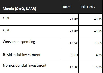 Най-забележимата промяна в актуализираните данни за годишното БВП беше рязкото повишение на растежа на БВП за второто тримесечие. Както вече казахме това се дължи главно на по-силните от очакваните потребителски разходи (2,5% спрямо 1,6% преди това), особено за услуги (2,6% спрямо 1,2% преди това). Разходите за стоки бяха ревизирани надолу (2,2% спрямо 2,4% преди това).