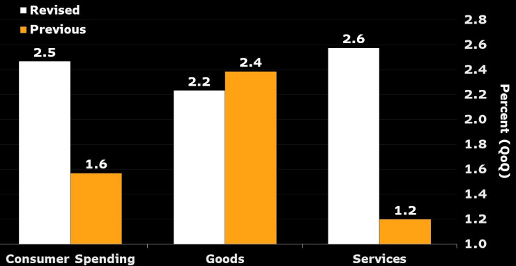 Потребителските разходи — основният двигател на икономическия растеж — нараснаха с 2,5% на годишна база. Ревизия нагоре отразява по-големите разходи за транспортни услуги, както и за финансови услуги и застраховки.