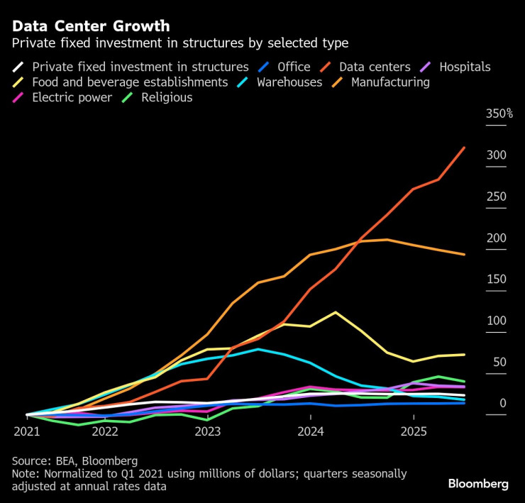 Разбира се, този бърз растеж се дължи на малка база: като дял от икономиката, инвестициите в центрове за данни все още са малки – допринасяйки с приблизително 3 базисни пункта за растежа на БВП през първата половина на 2025 г. Като цяло, Bloomberg Economics оценява, че всички дейности, свързани с изкуствения интелект (не само центровете за данни), вероятно са допринесли с 1 процентен пункт за растежа на БВП през първата половина на годината.