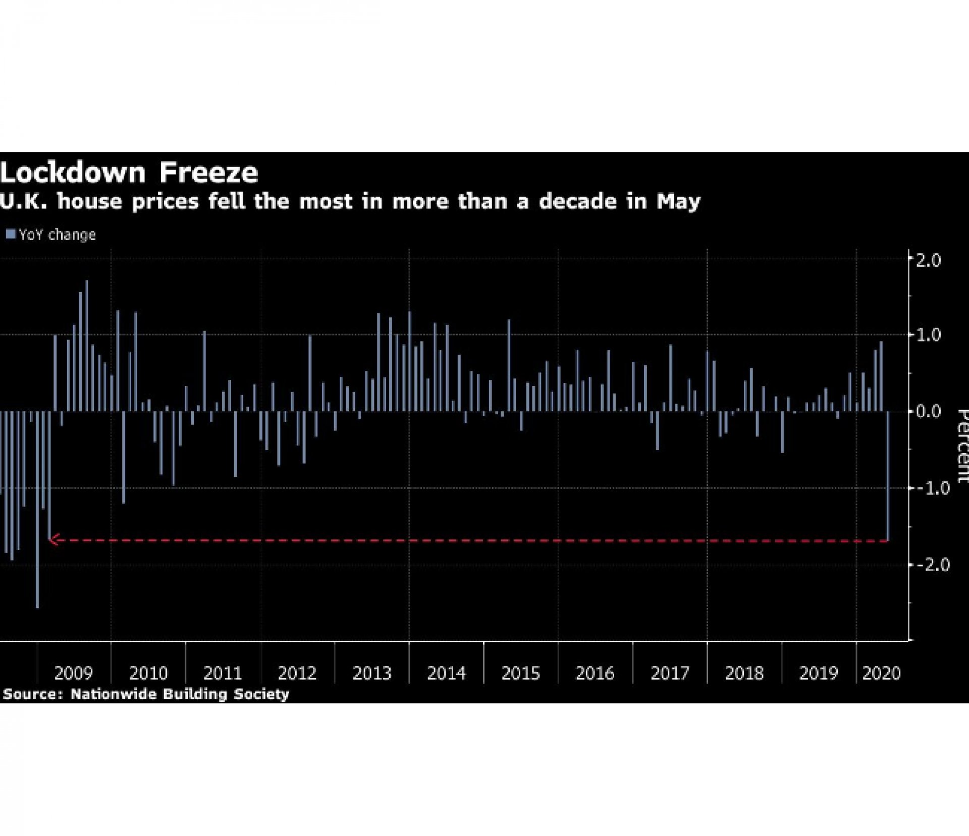 Цените на жилищата във Великобритания паднаха през май най-много от повече от десетилетие, след като блокирането заради пандемията се отрази и на пазара на жилища, сочат данни на Nationwide Building Society, цитирани от Bloomberg.