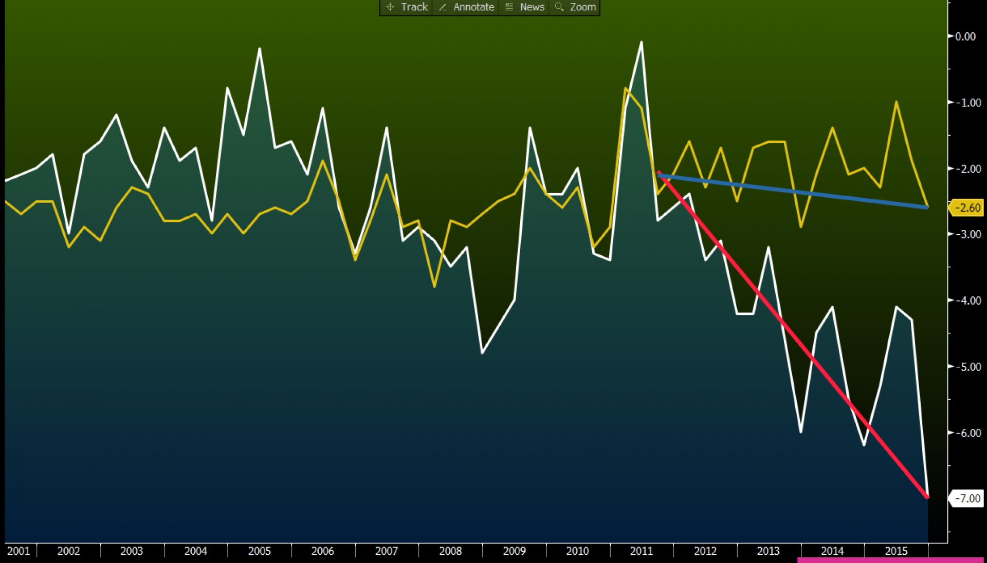 Днешната графика на деня е и графика и на седмицата, и на годината, според Том Кийн от Bloomberg Surveillance. Тя показва движенията на баланса по текущата сметка на Великобритания (в бяло), търговския ѝ баланс (в жълто) и изгладените им посоки в червено и синьо, респективно.