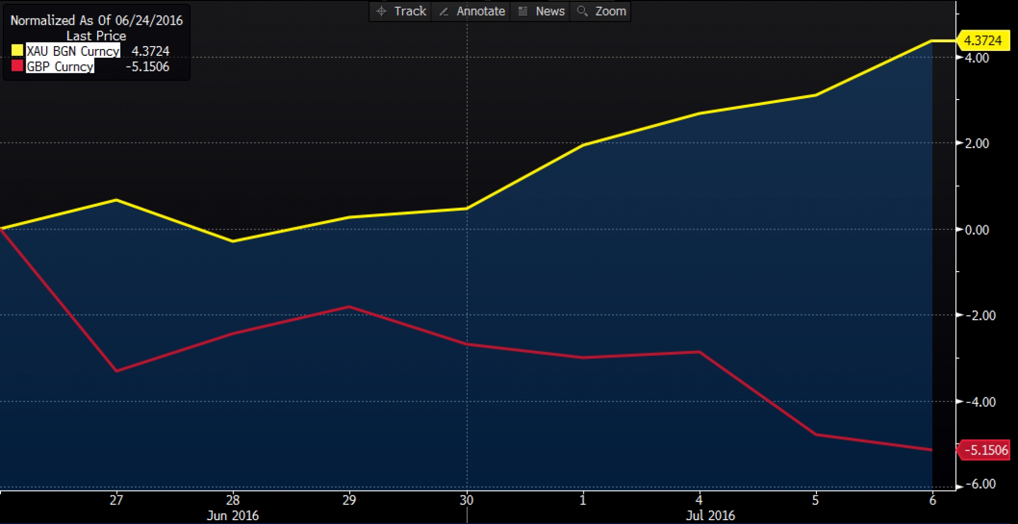 Графиката показва процентното изменение на златото (в жълто) и паунда (в червено) след вота за Brexit на 23 юни Източник: Bloomberg Terminal