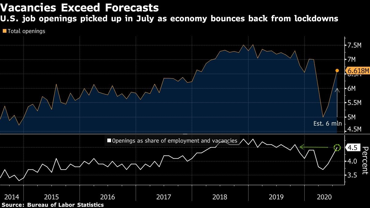 Броят на наличните позиции нараства до 6,62 милиона през месеца спрямо ревизираните налични 6 милиона свободни работни места през юни, сочат данни на трудовото министерство на страната, публикувани в сряда.