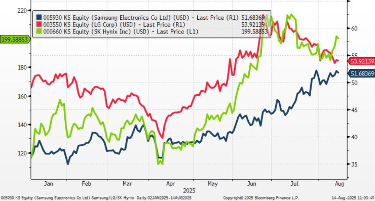 Цената на акциите на Samsung, LG и Sk Hynix (в долари)