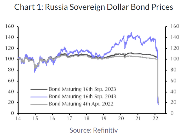 За чуждестранните инвеститори „фалитът до голяма степен е включен в оценката“, пише икономистът, отбелязвайки, че руските суверенни доларови облигации вече се търгуват на около 20 цента за един долар (вижте графиката по-долу).