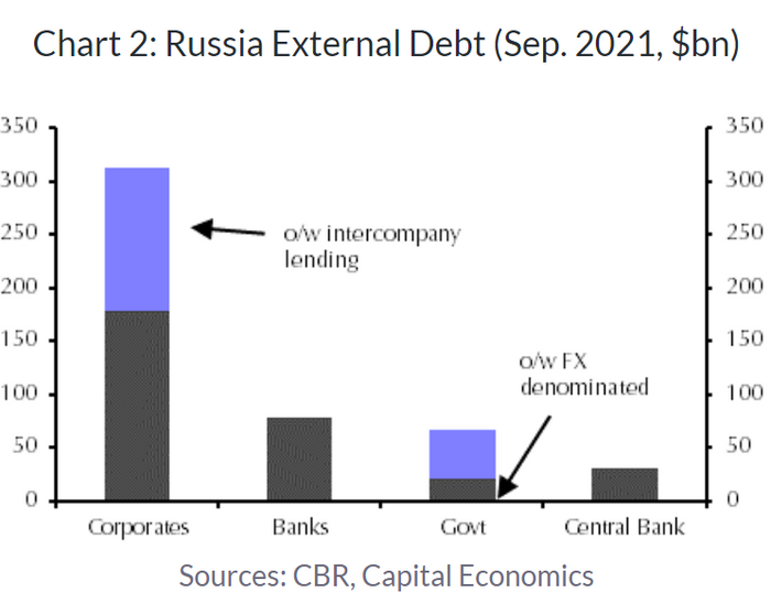 Второ, суверенният фалит може да бъде прелюдия към неизпълнението на задълженията на руските корпорации, предупреди той, чиито външни дългове са много по-големи от тези на правителството (вижте графиката по-долу).