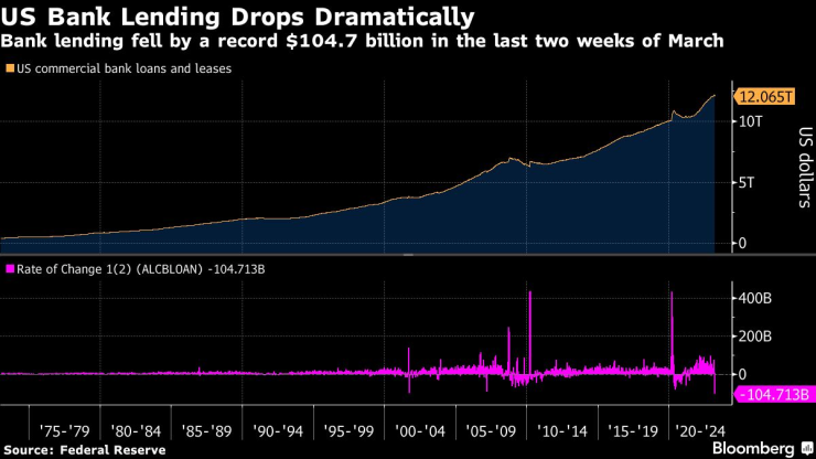 През последните две седмици на март банковото кредитиране в САЩ се свива с най-много досега, което показва затягане на условията за кредитиране след няколко известни банкови фалита, които рискуват да навредят на икономиката.