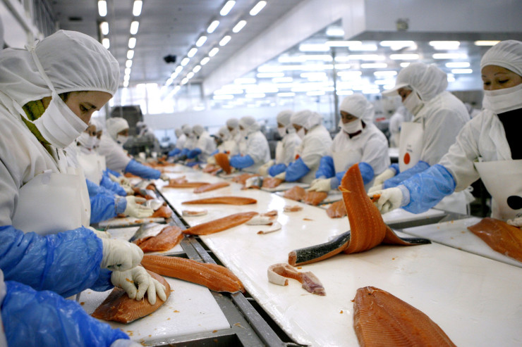 Работници филетират сьомга в преработвателно предприятие в Пуерто Монт, Чили. Фотограф: Луис Серхио/Bloomberg