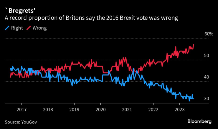 Около 57% от британците са заявили пред YouGov, че Обединеното кралство е сгрешило, гласувайки за Брекзит през 2016 г., което е най-високото ниво, регистрирано от социологическата компания. Всеки пети британец, гласувал за напускане на ЕС през 2016 г., сега казва, че това е било погрешно решение.