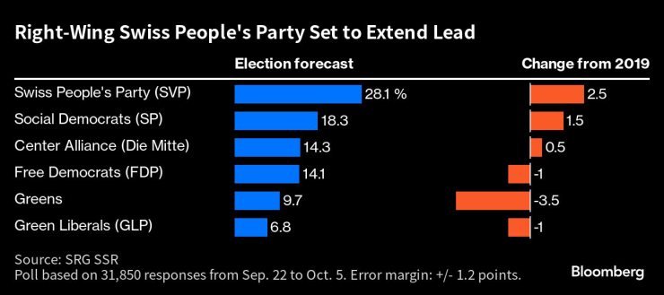 Партията, известна още като SVP, може да очаква 28,1% от гласовете въз основа на настоящите нагласи, според окончателното проучване на обществената телевизия SRG SSR. След нея се нареждат лявоцентристките социалдемократи с 18,3% и привържениците на традиционните ценности от Алианс на центъра с 14,3%.
