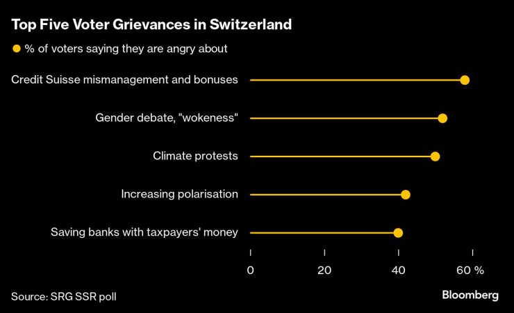 Швейцарската дясна Народна партия е напът да затвърди позицията си на най-голяма парламентарна група на националните избори по-късно този месец, тъй като имиграционните страхове стават основен проблем, а последиците от Credit Suisse подриват подкрепата за политиците, подкрепящи бизнеса.
