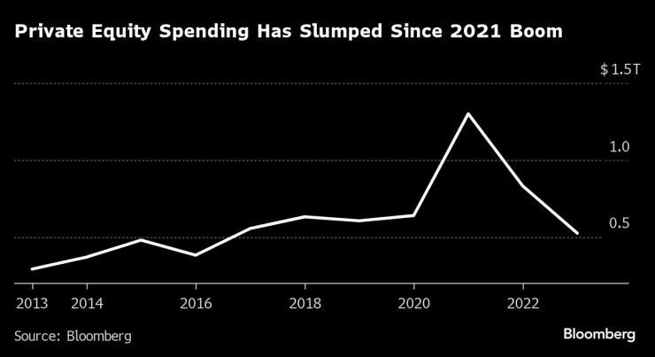 Липсата на активност от страна на дружествата за дялово инвестиране отново е един от основните фактори, затрудняващи притока на сделки през 2023 г. Фирмите за изкупуване са похарчили с 36% по-малко средства за придобивания през тази година в сравнение с 2022 г. на фона на трудностите при осигуряването на дългово финансиране за големи сделки и несъгласието с цените на продавачите - дори когато предлагат големи премии.