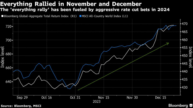 През последните месеци световните борси бяха подкрепени от залозите на основните централни банки, включително Федералния резерв, че през следващата година ще намалят агресивно лихвените проценти, тъй като инфлацията намалява. Доходността на облигациите се понижи, а S&P 500 се доближи до нов рекорд.
