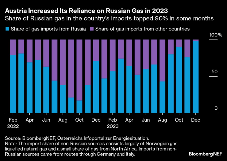 Изобилните руски доставки през миналата година позволиха на Австрия, един от най-старите клиенти на Газпром в Западна Европа, да увеличи потреблението. OMV AG, държавният енергиен гигант на страната, има дългосрочен руски договор за доставка до 2040 г., който го задължава да купува газ, достигащ до австрийската граница. През декември това означаваше, че Газпром покрива 98% от нуждите на страната.