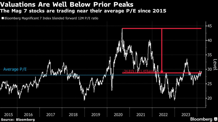 Мислав Матейка от JPMorgan Chase & Co. заяви в бележка, разпространена в понеделник, че оценките на седемте технологични гиганта, които са двигател на ралито, са под петгодишната им средна стойност спрямо останалата част от S&P 500. В същото време стратези на Goldman Sachs Group Inc. заявиха миналата седмица, че макар концентрацията на пазара да е най-високата от десетилетия, водещите имена се търгуват при значително по-ниски оценки, отколкото техните аналози в пика на технологичния балон.