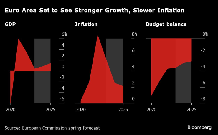 В своята пролетна прогноза Европейската комисия предвижда растеж на БВП през 2024 г. от 1,0% в ЕС и 0,8 % в еврозоната. През 2025 г. се очаква ръстът на БВП да се ускори до 1,6% в ЕС и до 1,4% в еврозоната. Очаква се инфлацията по ХИПЦ в ЕС да намалее от 6,4% през 2023 г. на 2,7% през 2024 г. и на 2,2% през 2025 г. В еврозоната се очаква тя да се забави от 5,4% през 2023 г. на 2,5% през 2024 г. и на 2,1% през 2025 г.