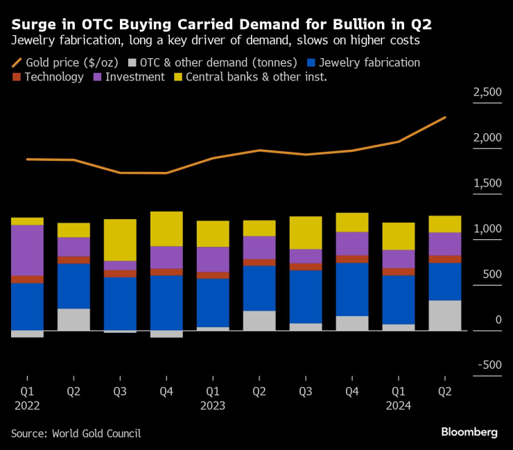Според Световния съвет по златото силното купуване на физически кюлчета, особено в Азия, е помогнало на потреблението на злато да отбележи най-доброто си второ тримесечие от поне 25 години насам. Асоциацията на производителите твърди, че по-нататъшният ръст на търсенето на извънборсовия пазар, който включва и някои покупки от централните банки, се очаква да бъде основен двигател на поскъпването на златото.