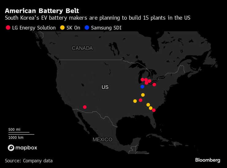 Половината от корейските заводи бяха обявени след подписването на Закона за намаляване на инфлацията през 2022 г., като обещаха да създадат общо над 20 000 работни места, разположени предимно в така наречения „пояс на батериите“, който се простира от Мичиган през Охайо и Кентъки до Джорджия.