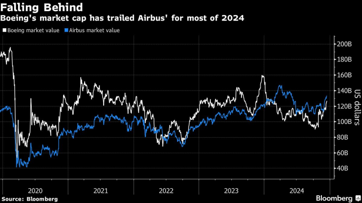 Boeing изостава по пазарна капитализация от AirBus през почти цялата 2024 г.