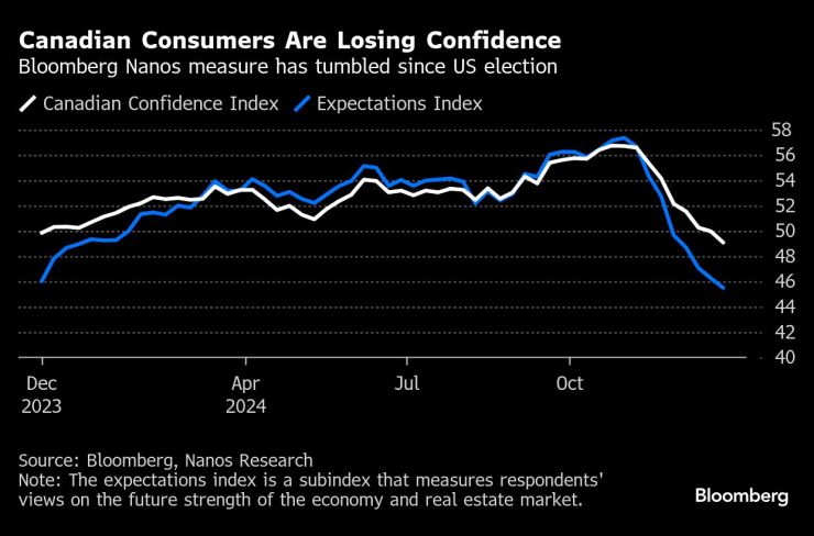 Канадският индекс на доверието Bloomberg Nanos, мярка за настроенията, базирана на седмични проучвания, разшири спада си и достигна 49,08, най-ниското ниво от ноември 2023 г. насам. Показание под 50 означава нетни негативни мнения.