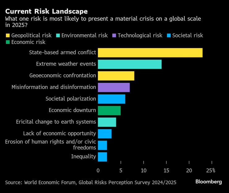 „Въоръжен конфликт на държавно ниво“ е най-неотложната непосредствена тревога за 2025 г., посочена от около една четвърт от 900-те респонденти в годишното проучване, публикувано броени дни преди елитната среща на организацията в швейцарския планински курорт Давос.