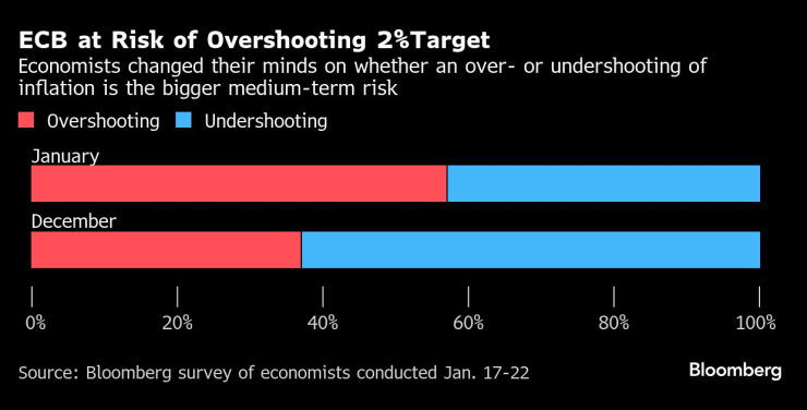 Същевременно икономистите - с промяна спрямо предходните месеци - вече са по-загрижени, че ЕЦБ ще свали инфлацията под 2% в средносрочен план.