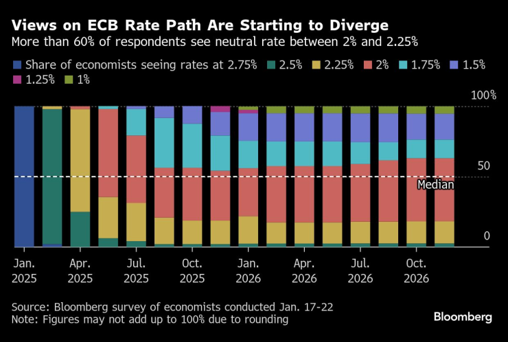 Анализаторите, анкетирани от Bloomberg, са единодушни в прогнозите си за намаляване на депозитната лихва с четвърт пункт до 2,75% в четвъртък. Мнозинството не очаква председателят Кристин Лагард да даде официална заявка за бъдещи стъпки, въпреки че много нейни колеги от Управителния съвет отбелязаха, че през март вероятно ще последва още едно намаление.