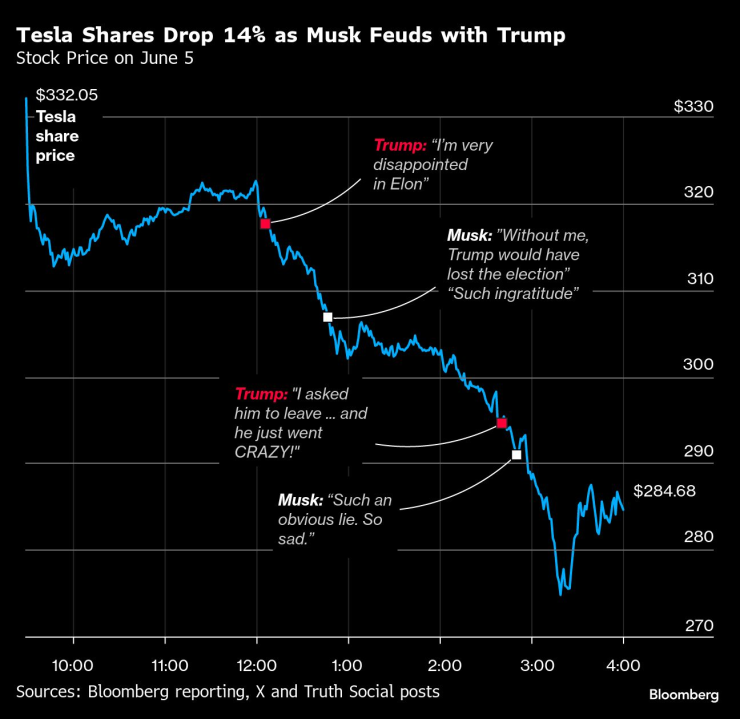 Акциите на Tesla Inc. се сринаха, след като тлеещата вражда между Илон Мъск и президента Доналд Тръмп прерасна в публична словесна война между двама от най-влиятелните хора в света.