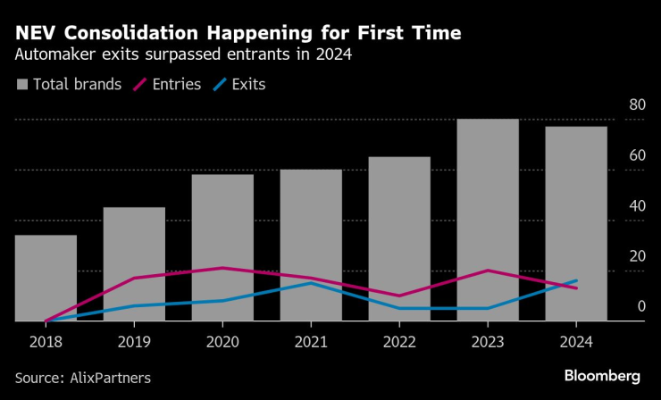 Междувременно доклад на AlixPartners от април подчертава интензивната конкуренция, която започва да се появява сред производителите на нови енергийни превозни средства, или компании, които произвеждат автомобили с чисто батерии и хибридни автомобили с възможност за зареждане от електрическата мрежа. През 2024 г. пазарът преживя първата си консолидация сред марките, специализирани в NEV, като 16 от тях излязоха от пазара, а 13 се появиха.