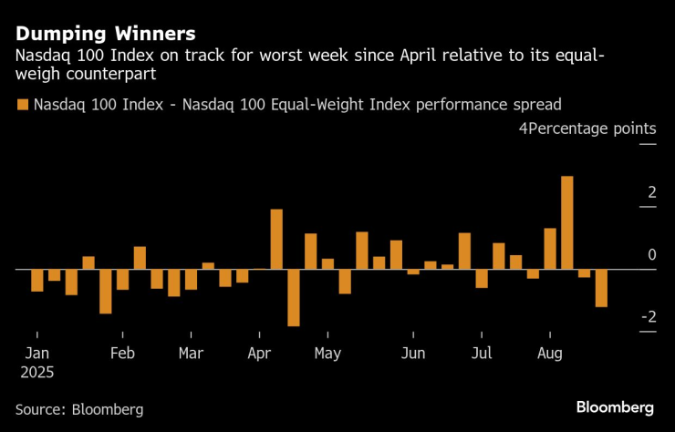 Около 660 милиарда долара бяха изтрити от S&P 500 в рамките на четири дни, като индексът загуби около 1,1% през това време. Еднакво претеглена версия на индекса S&P 500, която не прави разлика между пазарната стойност на гигант като Amazon.com Inc. и относително малка компания като Axon Enterprise Inc., е нараснала с по-малко от 0,1%.