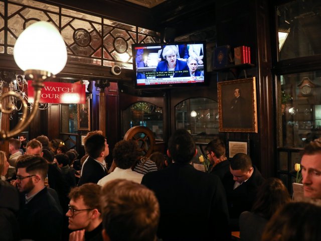 Клиенти в бар до Уестминстър следят вота по телевизията. Лондон. 15 януари 2019. Photographer: Simon Dawson/Bloomberg.