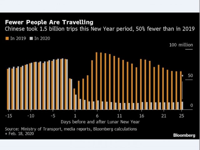 Броят на пътуванията със самолет, влак, автомобили и лодки в навечерието на Лунната нова година е бил същият както и в предходната година, но спадът след началото на годината на плъха на 25 януари е очевиден. Средно се предприемат едва около 20% от обичайния брой на пътуванията всеки ден, което значи, че милиони хора все още не са се върнали на работа. На автобусните линии на дълги разстояния е позволено да пътуват на една 50% от капацитета си, за да се ограничи разпространението на заразата. Това означава, че блокирането на бизнес процесите все още не е преодоляно. Около 80 милиона мигриращи работници са се върнали на работното си място, а още около 120 милиона ще се върнат до края на февруари, обяви представител на министерството на транспорта. Цели 100 милиона работници обаче ще се върнат на работното си място след началото на март.