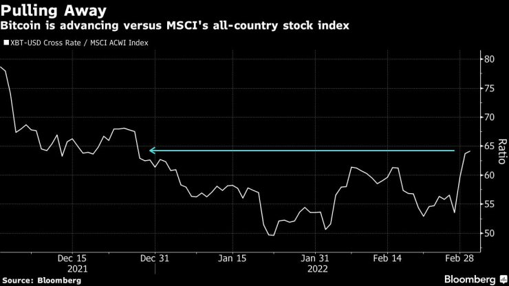 Криптовалутите продължиха да се откъсват от акциите на фона на разрастващата се война в Украйна, която подтиква инвеститорите да търсят сигурни убежища.