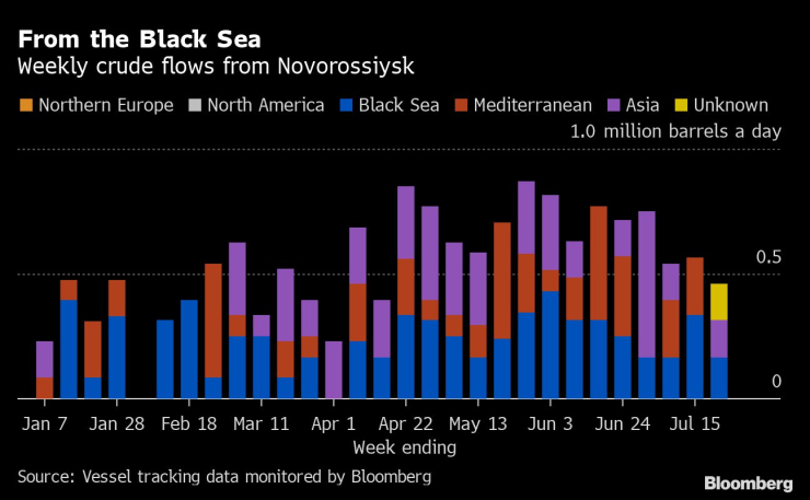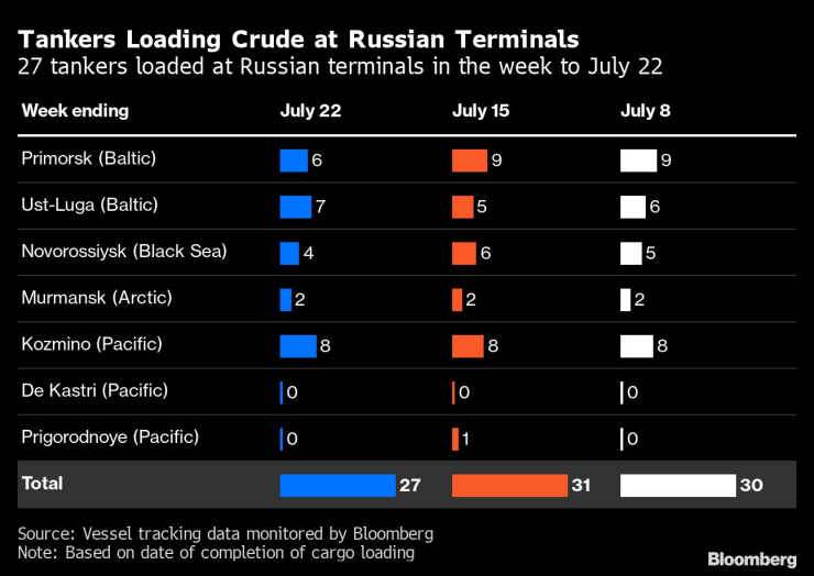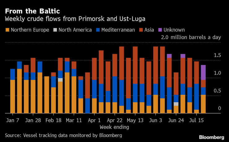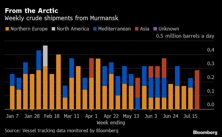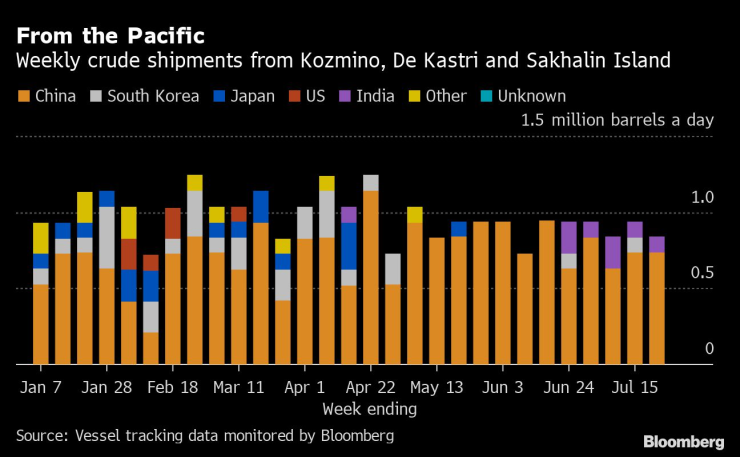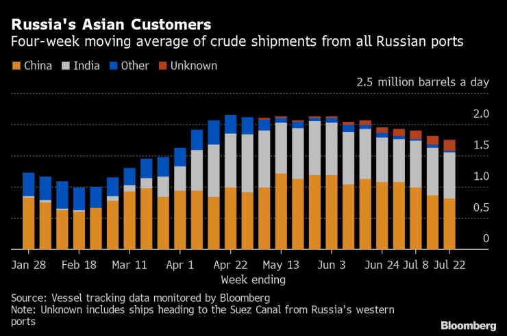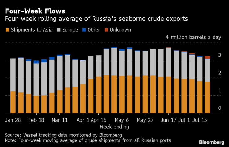 Въз основа на текущите дестинации средният поток от руски суров петрол за Азия през четирите седмици до 22 юли е най-ниският от 16 седмици насам - 1,75 млн. барела на ден. Това ще остане вярно, дори ако целият суров петрол на танкери, които все още не са посочили къде се отправят, започне да сигнализира за азиатски пристанища през следващите седмици.