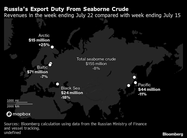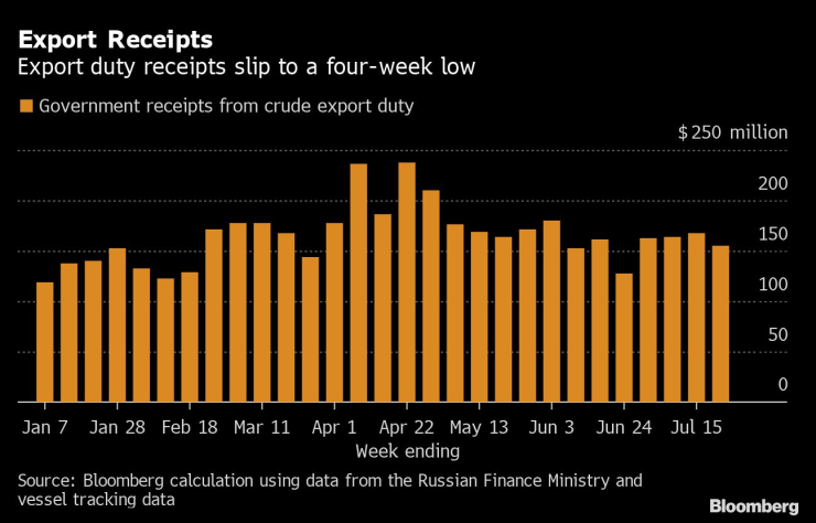 Според изчисления на Bloomberg приходите на Москва от експортни мита са намалели през седмицата до 22 юли с 13 млн. долара, или 8%, до 155 млн. долара от 168 млн. долара през седмицата до 15 юли.