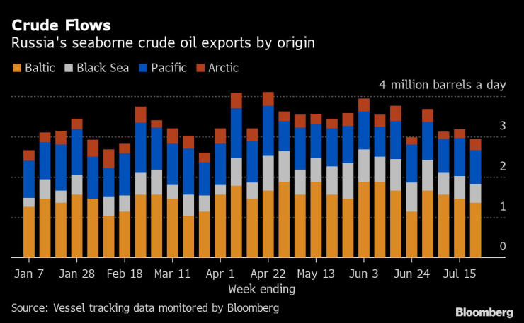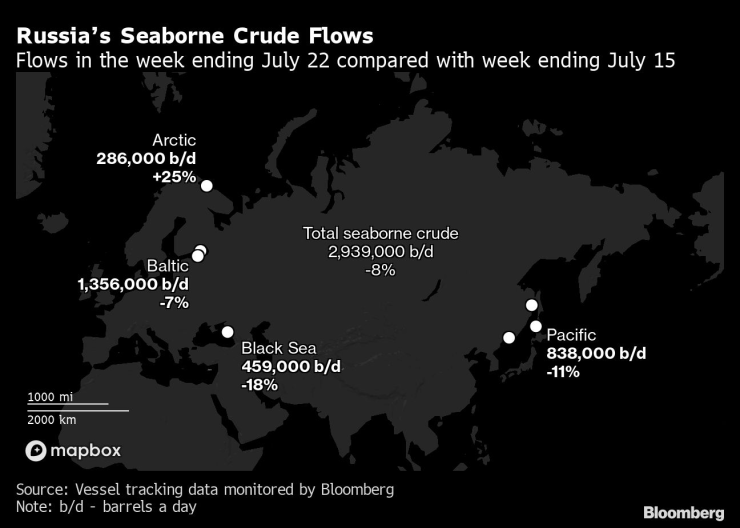 На седмична база общият поток на суров петрол от руските пристанища намалява с 250 000 барела дневно, или с 8%, до 3,19 млн. барела дневно през седемте дни до 22 юли.