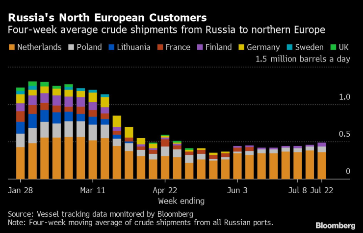 Обемът на доставките от Русия за Северна Европа продължава да се увеличава. По-голямата част от него се влива в резервоари за съхранение в Ротердам, Нидерландия, а малки количества отиват в Полша и Финландия. Потокът през четирите седмици до 22 юли възлиза средно на 490 000 барела дневно, което е най-високото ниво от 12 седмици насам (вж. графиката по-долу).
