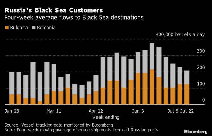 Комбинираните доставки за България и Румъния са намалели с 45% от средата на юни на четириседмична база, като през четирите седмици до 22 юли са били средно 208 000 барела на ден (вж. графиката по-долу). Доставките за България са намалели от най-високите си стойности през юни, докато доставките за Румъния през последния четириседмичен период са били по-малко от половината от скорошния им връх.
