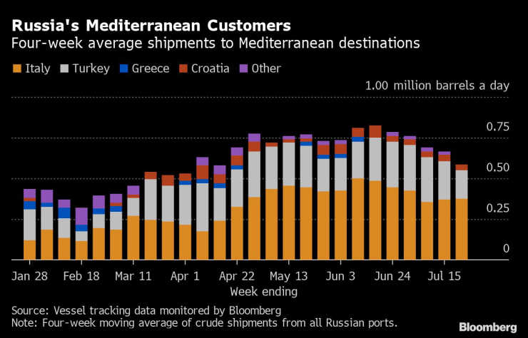Четириседмичните средни доставки на руски суров петрол за Средиземноморието, които нараснаха след нахлуването в Украйна, намаляват от средата на юни. През периода до 22 юли те са най-ниските от 14 седмици насам, което се дължи на спада на обемите, насочени към турските пристанища (вж. графиката по-долу).