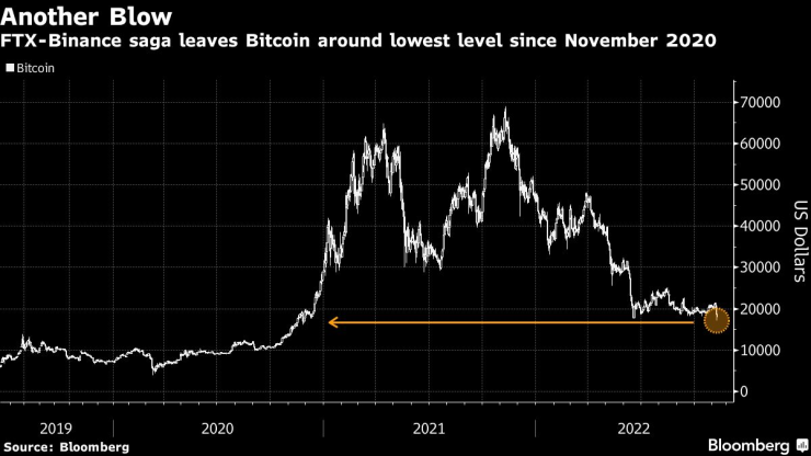 Криптовалутите разшириха спада, тъй като потенциалното поглъщане от страна на Binance Holdings Ltd. на изпадналата в затруднение конкурентна борса FTX.com подчерта как напрежението в индустрията на цифровите активи удря някои от нейните най-големи играчи.