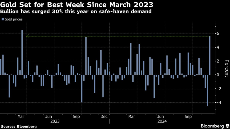 Цената на спот златото се повиши с 1,3% до 2 704,11 долара към 12:40 ч. в Ню Йорк, като седмичната му печалба достигна 5,5% досега през седмицата, което е най-доброто му представяне от март 2023 г. насам. Доларовият спот индекс на Bloomberg се повиши с 0,4%, увеличавайки двудневните си печалби. Среброто и платината поскъпнаха, докато цената на паладия спадна.