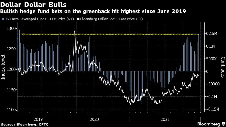 Доларът е добавил около 5% към стойността си, а Bloomberg Dollar Spot Index се насочва към най-голямото си годишно увеличение от 6 години. Проучване на Bank of America Corp. показва най-сериозните бичи настроения при позиционирането на активи от 2015 година. Нетните дълги позиции отворени от хедж фондове върху валутата са на най-високите нива от юни 2019 година, като това се дължи на очакването около ефекта от по-затегната парична политика в САЩ. Това е огромен обрат спрямо същия период на миналата година, когато късите позиции към долара бяха особено популярните на Уолстрийт.