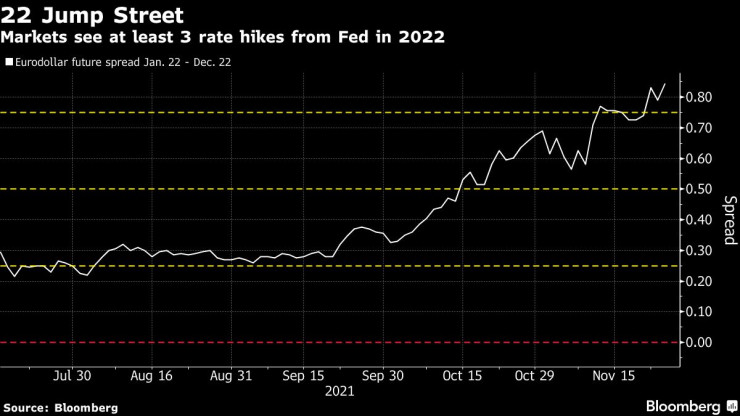 Цената на фючърсите върху двойката евро-долар предполага, че трейдърите очакват 3 увеличения на лихвите през 2022 година.