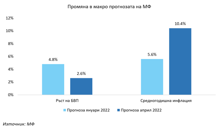 Цени и инфлация: очакваната цена на суровия петрол средно за цялата 2022 г. се увеличава от 79 до 100 долара за барел, а поскъпването на други неенергийни суровини – от заложени 8% през януари до близо 19%. В резултат, средногодишната инфлация се очаква да достигне 10,4%, при 5,6% в предходната прогноза. Заедно с това, по-скъпите енергоносители – на които България е нетен вносител – ще доведат до увеличение на търговския дефицит от 6,2% до 7,5%.