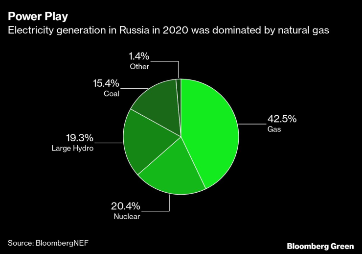 Руската икономика продължава да е силно зависима от изкопаемите горива, като въглищата и газът генерират около 58% от енергийните нужди на страната. Хидроенергията и ядрената енергия са генерирали почти 40% през 2020 г., като вятърната и слънчевата енергия едва се регистрират в енергийния микс на страната.